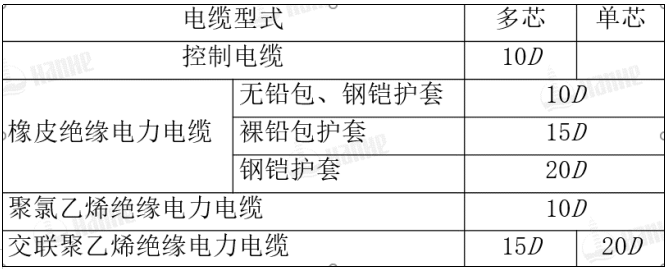 4.3敷設前檢查線路路徑,避免因路徑彎曲半徑過小造成護套開裂,XLPE絕緣電纜彎曲半徑不能小于電纜直徑的15倍(具體見下表)。