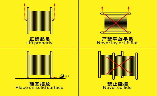 1.1. 電纜在運輸、搬運、存放及吊裝過程中,不得使電纜及電纜盤損傷;嚴禁將電纜盤直接由車上推下;電纜盤不應平放運輸、平放存儲及平放吊裝。